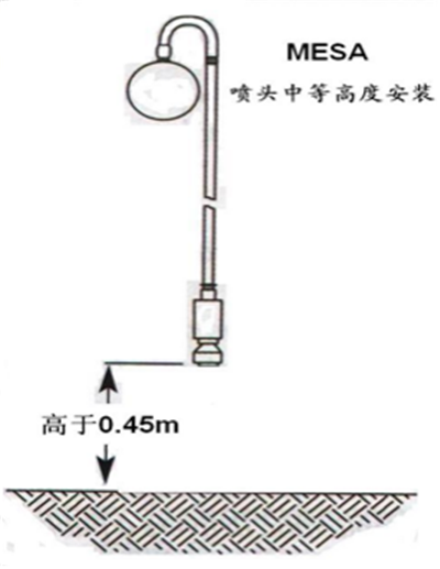 通常大型噴灌機(jī)的噴頭安裝高度(距離地面)都是根據(jù)作物進(jìn)行調(diào)節(jié),比如玉米一般是2米安裝高度,小麥?zhǔn)?/span>1.5米的安裝高度,高粱是2.5米的高度,這些都是一般采用中位安裝,噴頭高度在噴灌機(jī)主管與地面高度中間位置左右,用MESA表示(Mid-Elevation Spray application)。