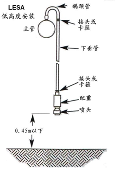 當(dāng)然大家可能會(huì)說(shuō)既然如此何不把噴頭降低,您說(shuō)的沒(méi)錯(cuò),但是這并不解決太大問(wèn)題,噴頭降低后,噴頭重合度降低,灌溉均勻度也隨之下降。這種叫低位安裝,指的是噴頭安裝在地面以上0.3-0.45米,用LESA表示(Low-ElevationSpray Application)。