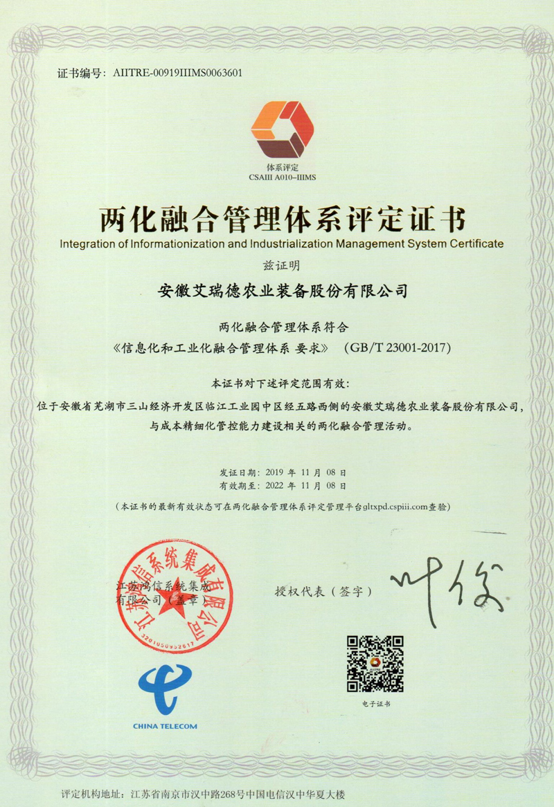 2019年11月,在公司全體員工的凝心聚力、團(tuán)結(jié)合作下,艾瑞德一舉拿下了兩化融合管理體系評(píng)定證書(shū)。