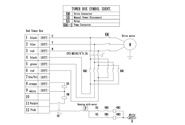 紫色線為百分率表信號(hào)線,進(jìn)入11端子后通過(guò)電源開(kāi)關(guān)SB直接接入跨體電機(jī)接觸器KM 線圈,控制跨體電機(jī)行走。橙色線為反轉(zhuǎn)信號(hào)線,進(jìn)入8端子后接入繼電器KA,繼電器KA的吸合和釋放決定了增壓泵接觸器KM1和KM2 哪一個(gè)啟動(dòng)。增壓泵啟動(dòng)粉色線從端子12進(jìn)入經(jīng)過(guò)電源開(kāi)關(guān)SB后接入壓力開(kāi)關(guān),壓力開(kāi)關(guān)出線接入繼電器KA常開(kāi)點(diǎn)和常閉點(diǎn),KA常開(kāi)點(diǎn)和常閉點(diǎn)出來(lái)后接入接觸器KM1和KM2。也就是橙色線決定增壓泵正反轉(zhuǎn),而粉色線決定增壓泵什么時(shí)候運(yùn)行,粉色線串進(jìn)壓力開(kāi)關(guān),壓力只有達(dá)到的情況下增壓泵才啟動(dòng)。