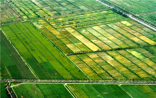 漢字里的“田”字,始見于商代甲骨文及金文,象形字。這個字形很像在一大片土地上畫出三橫三縱的九個方格,表示阡(豎線代表縱向田?。┠埃M線代表橫向田?。┛v橫無數(shù)的井田,有的甲骨文像畸形的地畝。簡體甲骨文將三橫三縱的阡陌簡化為一橫一縱的“十”。 (李學勤 編.字源.天津:天津古籍出版社,2013.07)為了澆灌方便,在傳統(tǒng)灌溉中都會將田地按照一定的寬度打上壟或田埂,這也就是我們經(jīng)常說“畦田”。同時,為了方便作業(yè),又分成了很多大小不一的地塊,地塊之間往往會有機耕道、土渠、河道、防風林等,從高空往下看,我國大部分的土地像是被人為切割好的一塊塊的長條地塊。